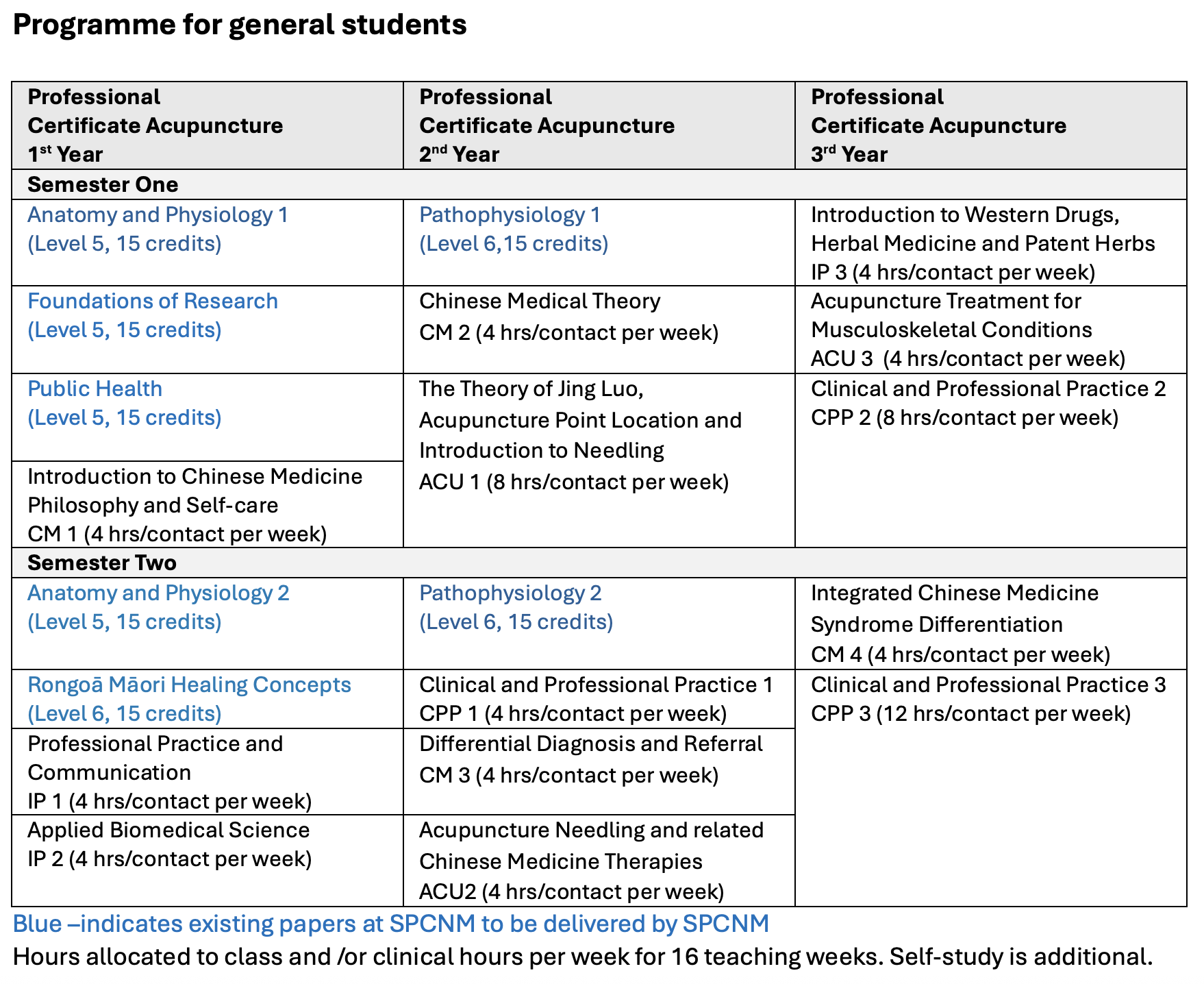 Courses in blue delivered online by the South Pacific College of Chinese Medicine
